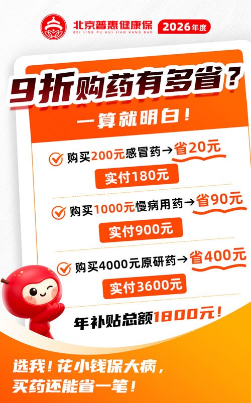 2026年度“北京普惠健康保”新增9折购药权益,年度补贴总额1800元。不管是日常常用药,还是高血压、糖尿病等慢性病必备药,参保人凭权益就能直接享9折优惠!哪怕平时没出险,谁都难免有买药需求,线上官方合作平台、线下指定药店都能使用。